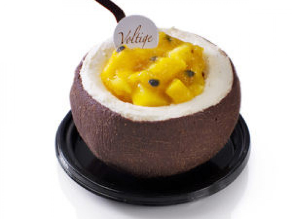 Biscuit noix de coco, crémeux passion, poêlée de mangue & mousse chocolat blanc